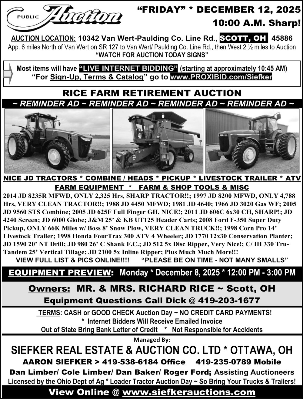 Dec 06, 2025. Siefker Real Estate & Auction Co. LTD Auctions Ads from The Lima News