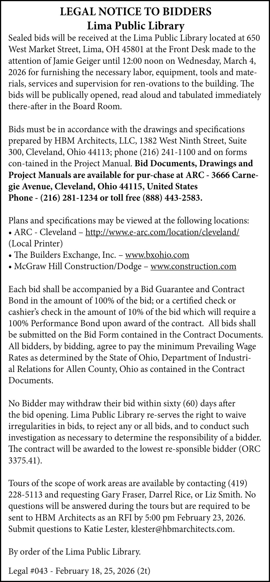 Feb 18, 2026. Lima Public Library Public Notice Ads from The Lima News