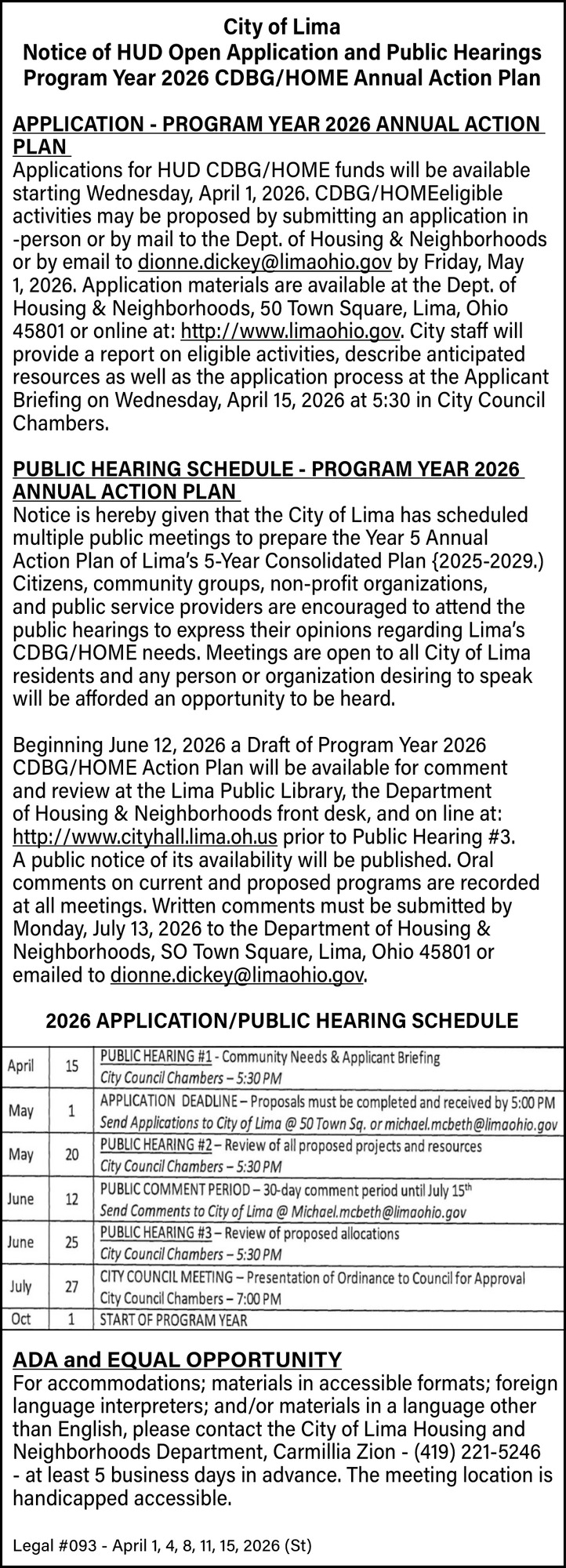 Apr 01, 2026. City of Lima Public Notice Ads from The Lima News